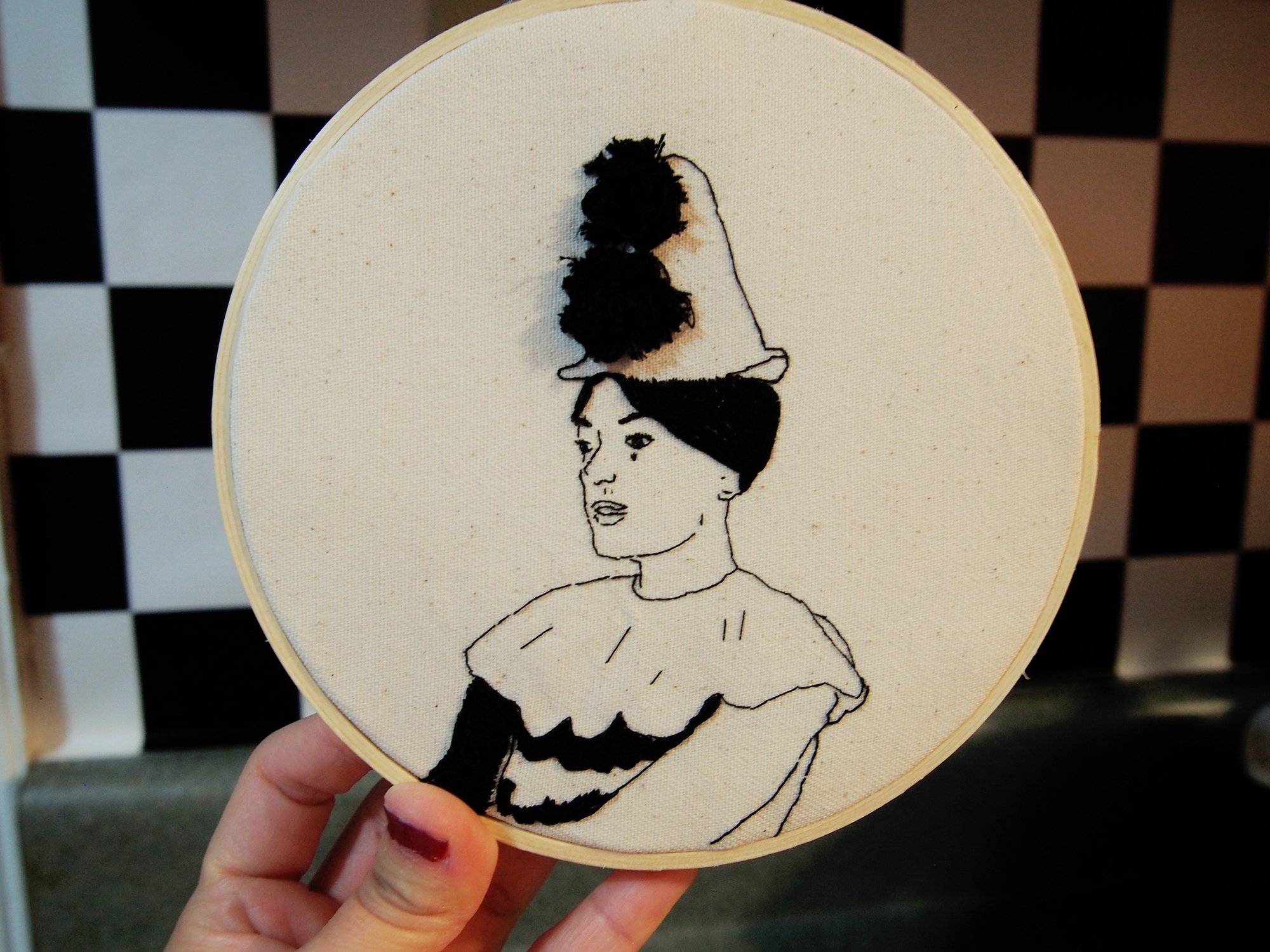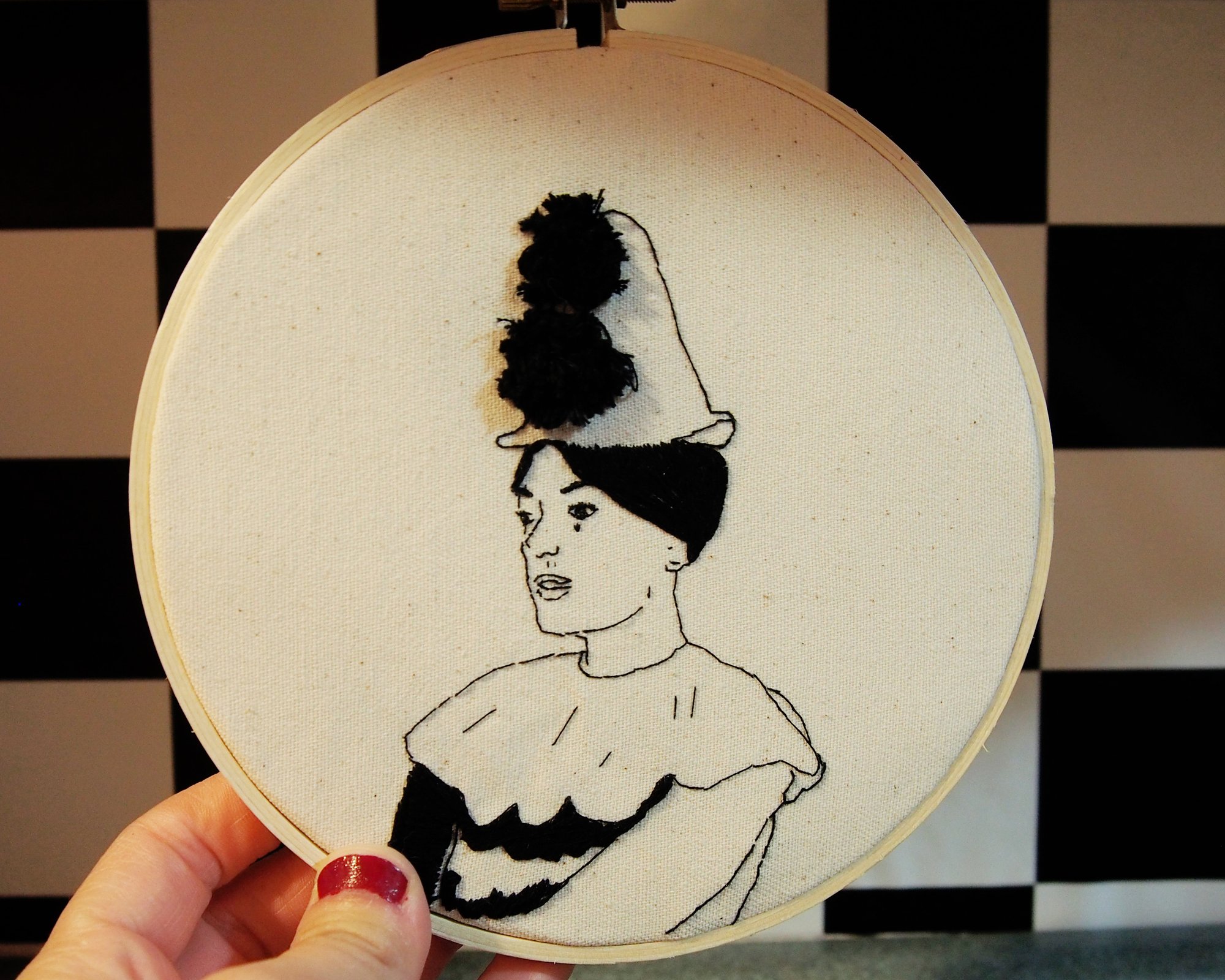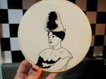 6 inch hand embroidered hoop of Lilly Allen in her 4chan stan visualizer